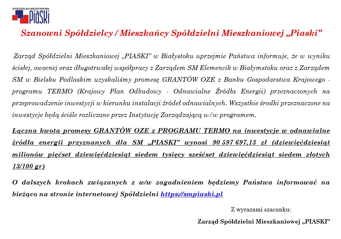 Zarząd Spółdzielni Mieszkaniowej „Piaski” w Białymstoku uprzejmie informuje o otrzymaniu potwierdzenia przejścia pierwszego etapu programu FEnIKS, a tym samym zakwalifikowania się do dalszego etapu.