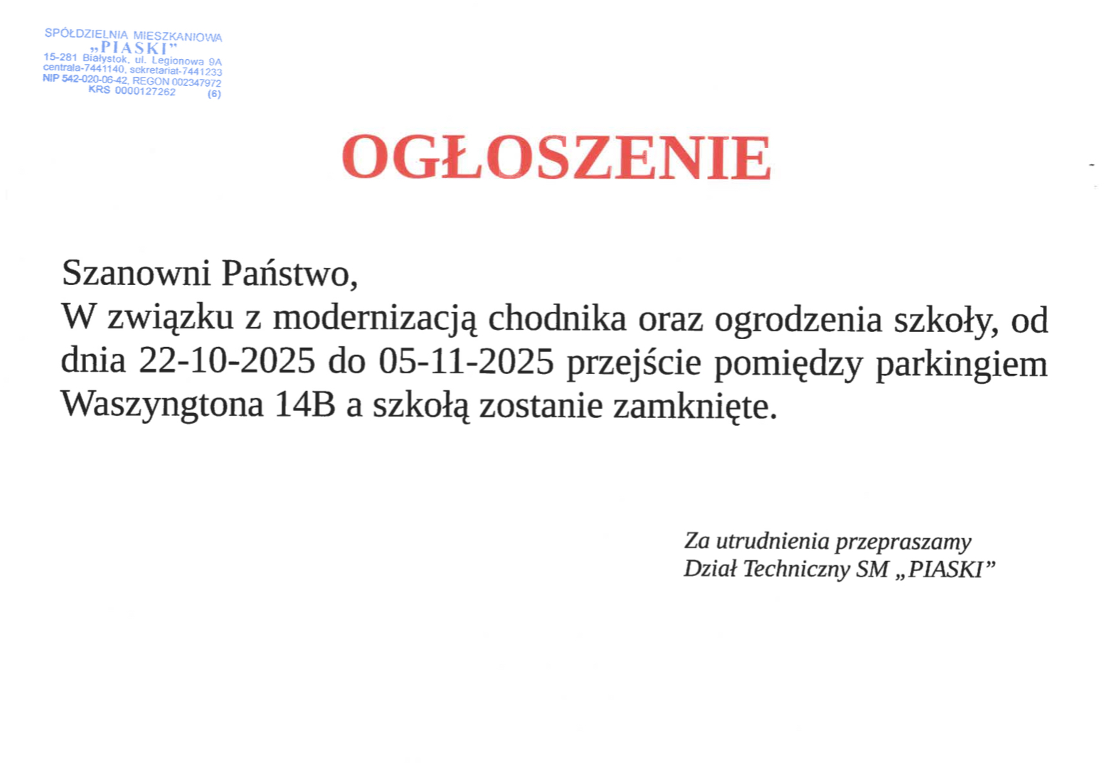 Modernizacja chodnika i ogrodzenia szkoły – zamknięcie przejścia