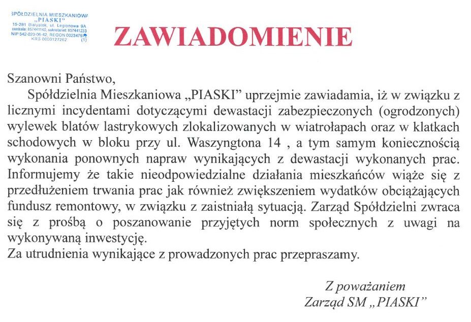 Dewastacja zabezpieczonych wylewek blatów lastrykowych w wiatrołapach i klatkach schodowych – Waszyngtona 14