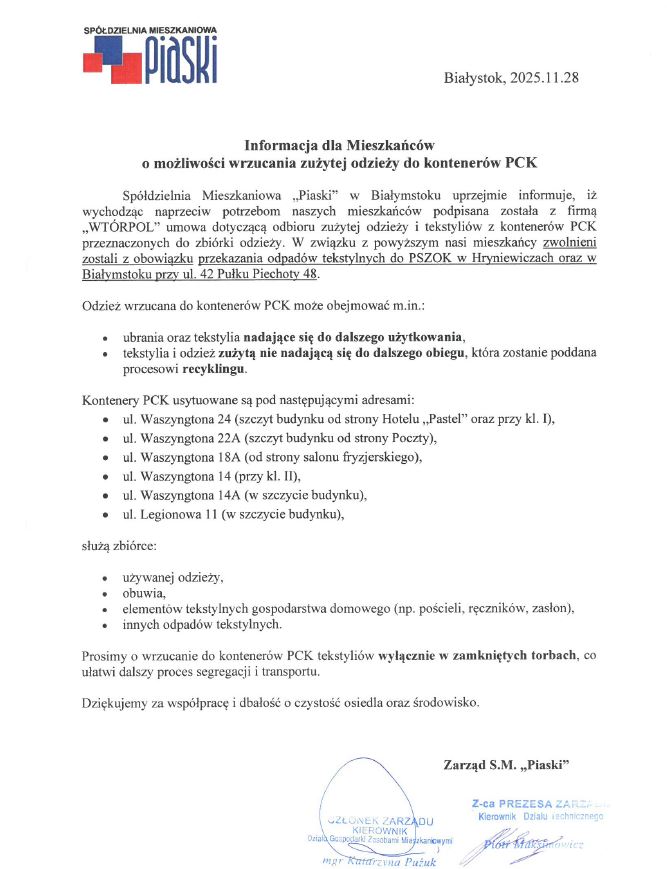 Informacja dla Mieszkańców o możliwości wrzucania zużytej odzieży do kontenerów PCK