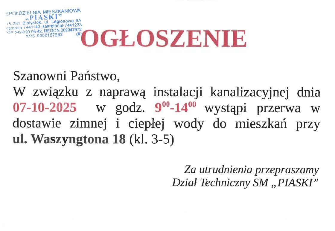 Przerwa w dostawie zimnej i ciepłej wody przy ul. Waszyngtona 18