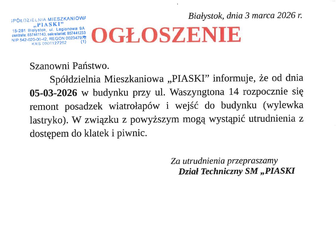 Utrudnienia z dostępem do klatek i piwnic – Waszyngtona 14