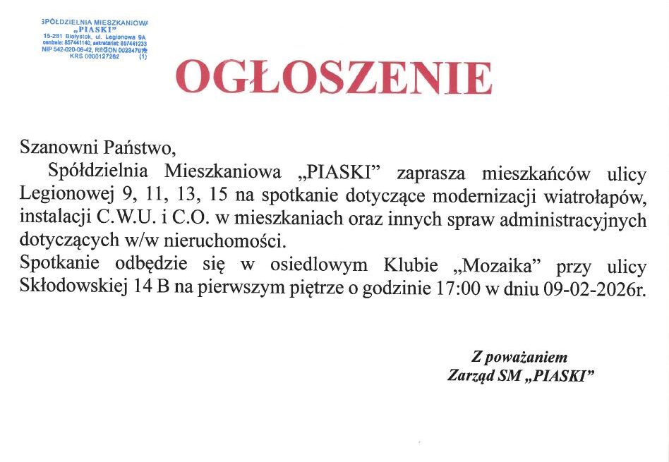 Zaproszenie na spotkanie mieszkańców ul. Legionowej 9, 11, 13, 15